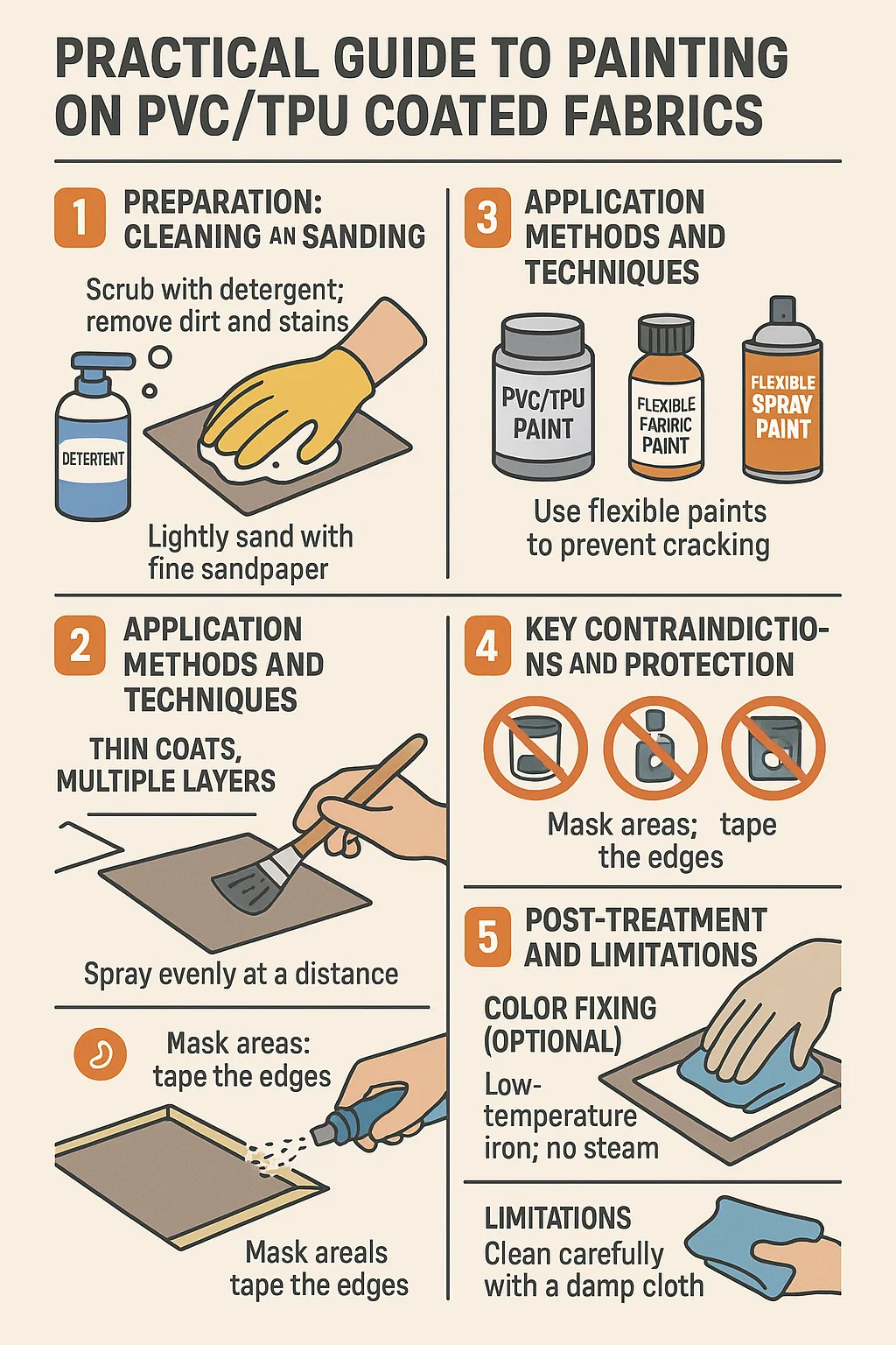 Tässä on käytännön opas maalaamiseen PVC-pinnoitetut kankaat ja TPU-pinnoitetut kankaat, joissa on yleinen käyttökokemus ja varotoimet: