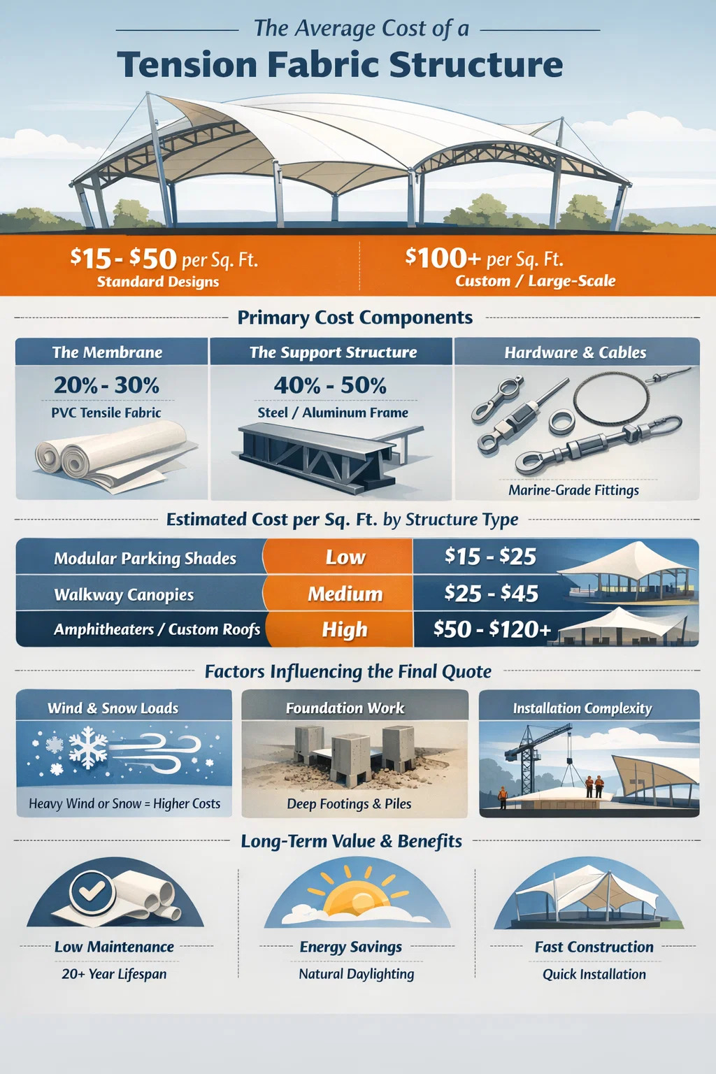 Kiristyskangasrakenteen hinta vaihtelee tyypillisesti 15–50 dollaria neliöjalkaa kohden standardimalleihin, kun taas pitkälle räätälöidyt tai suuret arkkitehtuuriprojektit voivat ylittää 100 dollaria per neliöjalka . Tämä hinta ei ole vain PVC-veto kangas itse; se kattaa täydellisen järjestelmän, joka sisältää suunnitellun teräsrungon, erikoislaitteiston, perustustyöt ja asiantuntevan asennustyön. Koska nämä rakenteet on suunniteltu kestämään tiettyjä tuuli- ja lumikuormia, hinnat vaihtelevat maantieteellisen sijainnin ja suunnittelun monimutkaisuuden mukaan.