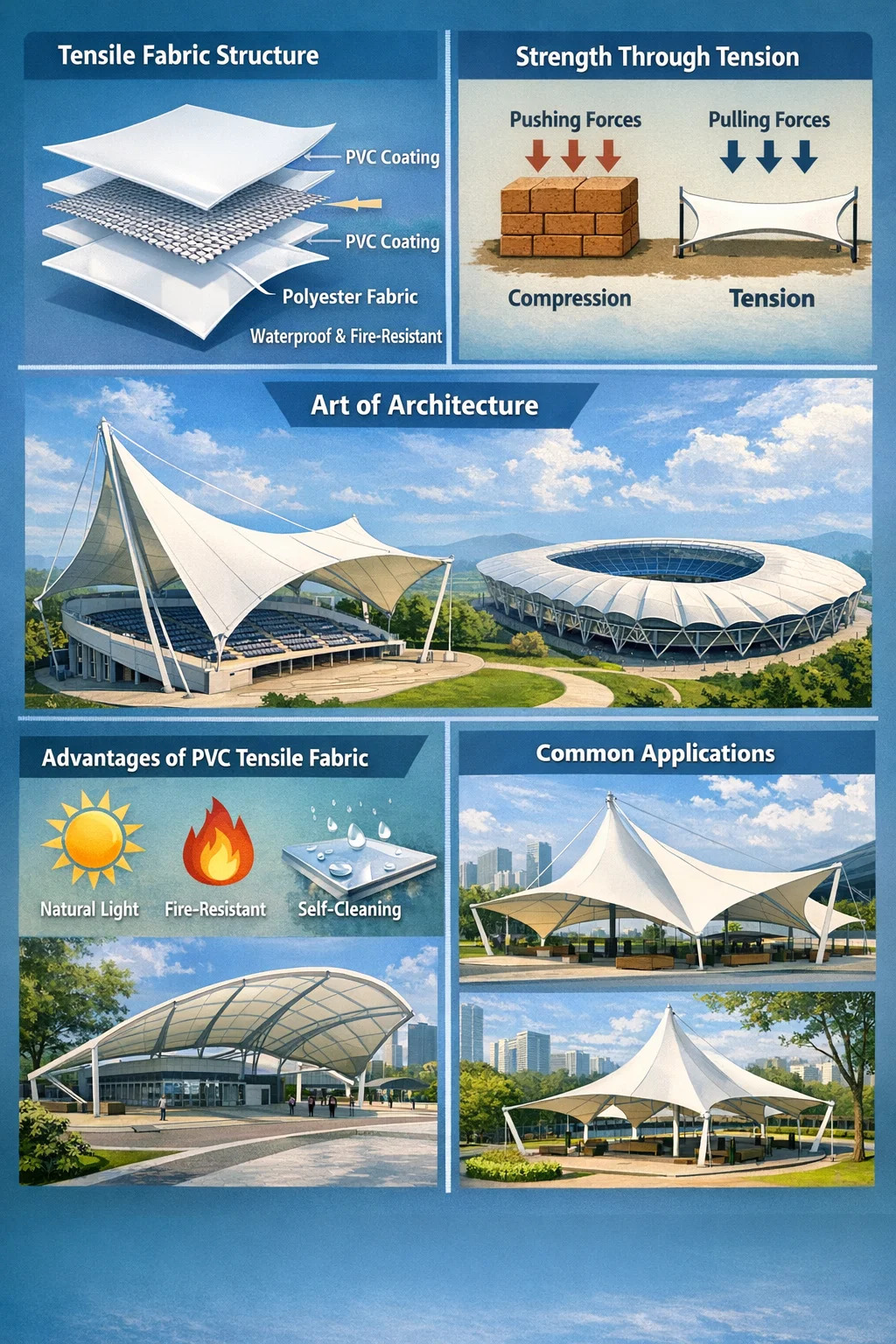 Kevyt ja läpinäkyvä: Se voi peittää erittäin suuria alueita (kuten koko stadionin katsomoa), mutta se ei vaadi tiiviitä pylväitä alla, mikä tarjoaa erinomaisen tilantuntuman.