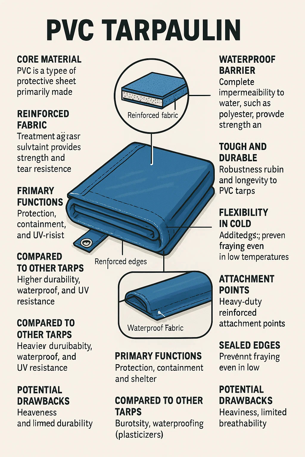 •Verrattuna muihin tarpeihin: Ne ovat yleensä kestävämpiä, vedenpitävämpiä ja UV-kestävämpiä kuin polyeteeni (poly) pressut, mutta ne ovat myös yleensä raskaampia ja kalliimpia. Ne tarjoavat erilaisen ominaisuuksien tasapainon verrattuna kankaalle tai vinyylipäällystettyyn polyesteripeitteeseen.